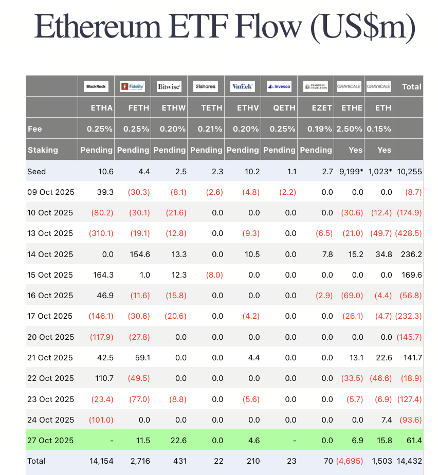 ETF 需求保持穩定,BTC ETF 吸引了 8400萬美元,ETH ETF 增加了 6100萬美元,不包括貝萊德數據。