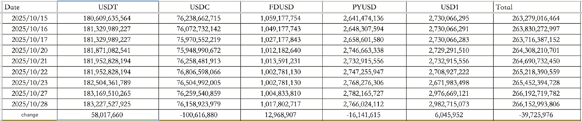 穩定幣流動性低迷。在10月28日,總流量顯示淨流出 3973萬美元,其中5802萬美元流入 USDT,10062萬美元流出 USDC,使得總供應量為 2661.5億美元。