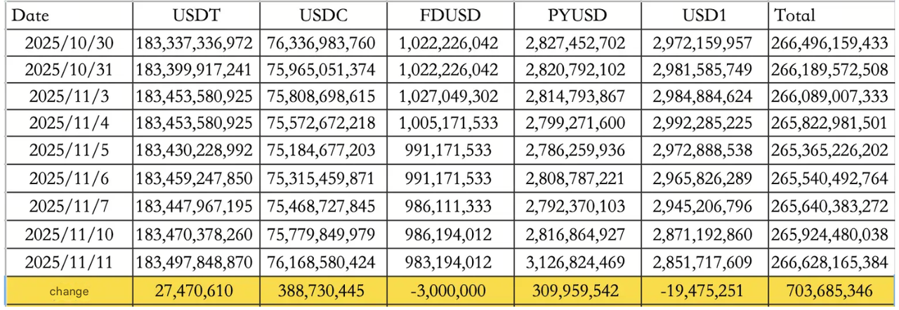 穩定幣淨流入7.0369 億美元,由USDC (+3.8873 億美元)和USDT (+2,747 萬美元)領導,將總供應推至2,666.3 億美元