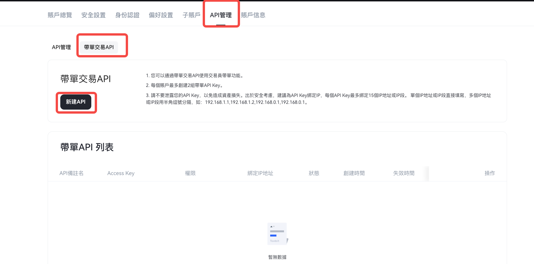 - 用API進行帶單交易的帶單員需要將Access Key和Secret Key更新成帶單交易的Access Key、Secret Key以避免發生無法帶單的情況