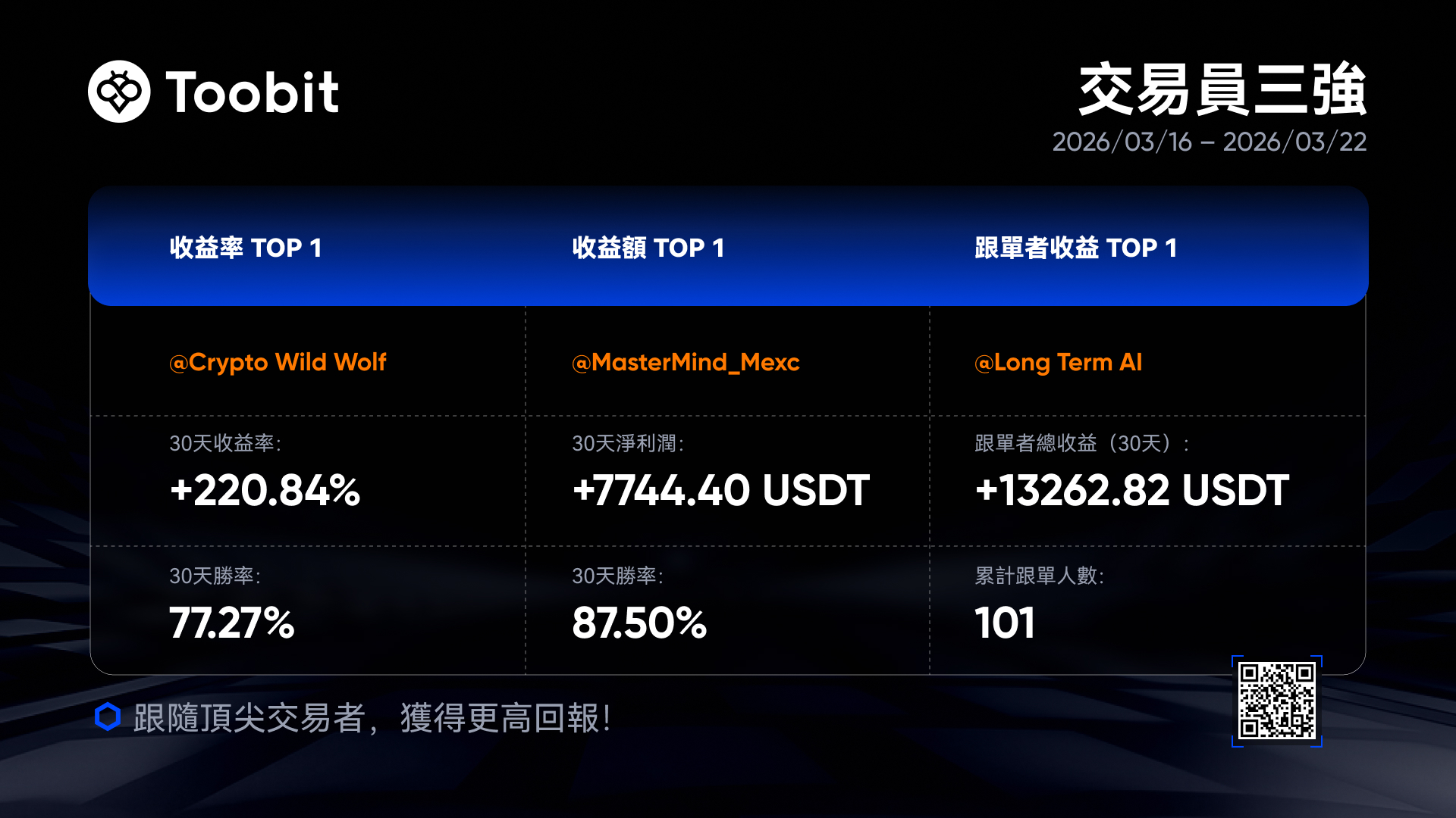 上週(2026.03.16 – 2026.03.22)站上英雄榜的三位交易員,每人将獲得100 USDT獎勵。