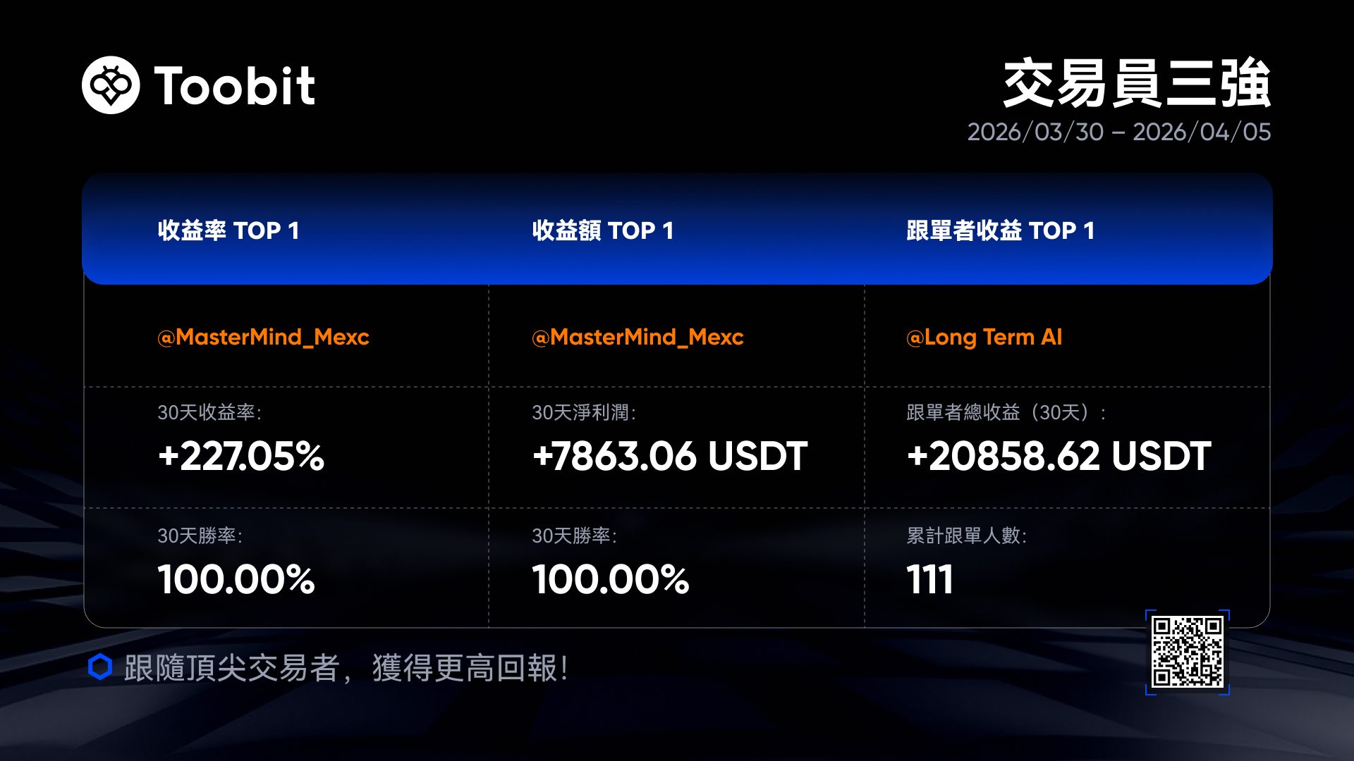 上週(2026.03.30 – 2026.04.05)站上英雄榜的三位交易員,每人将獲得100 USDT獎勵。