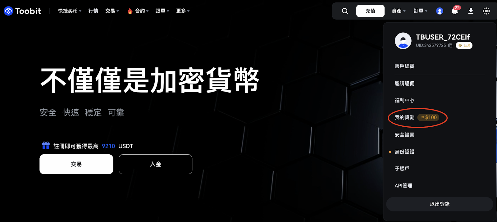 1. 進入Toobit 官網首頁並登入你的個人帳戶,點選【個人中心】,隨後點選下拉選單中的【我的獎勵】-【贈金】,即可查看合約贈金;