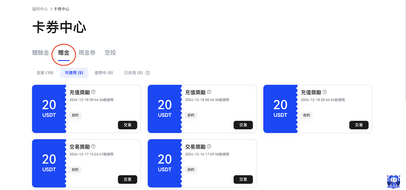 - 使用者也可以在合約頁面找到合約贈金,點選該頁面右上角【贈金下單】按鈕即可查看您的贈金。