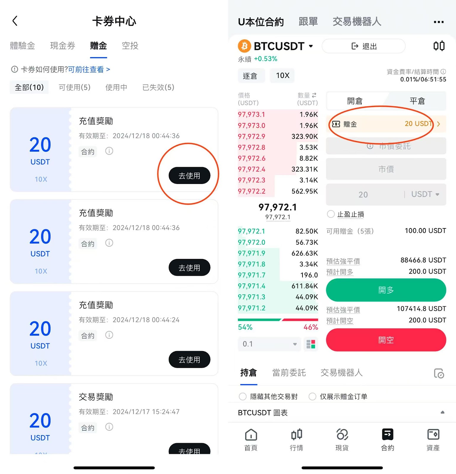 1. 在【卡券中心】-【贈金】,選擇可使用的合約贈金,點選「去使用」直達合約交易頁面,選擇贈金即可開倉;