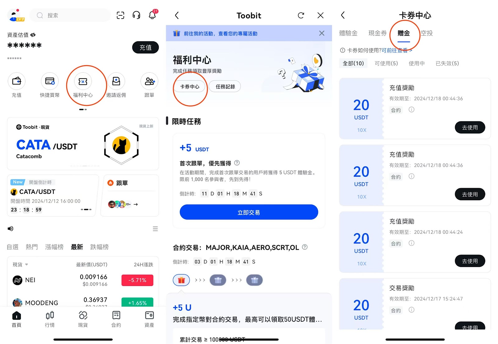 1. 進入Toobit APP,點選金剛位【福利中心】,進入後點選【卡券中心】-【贈金】;