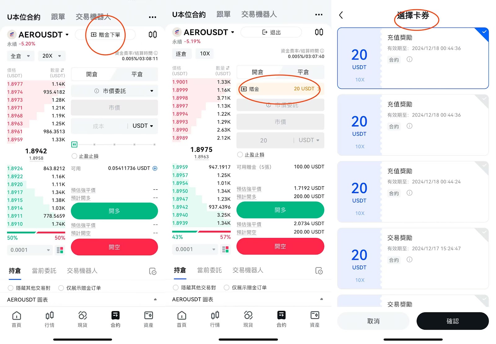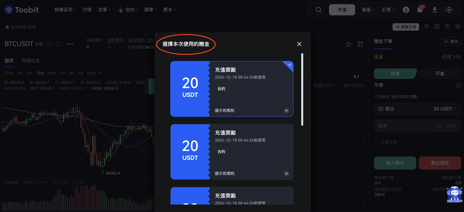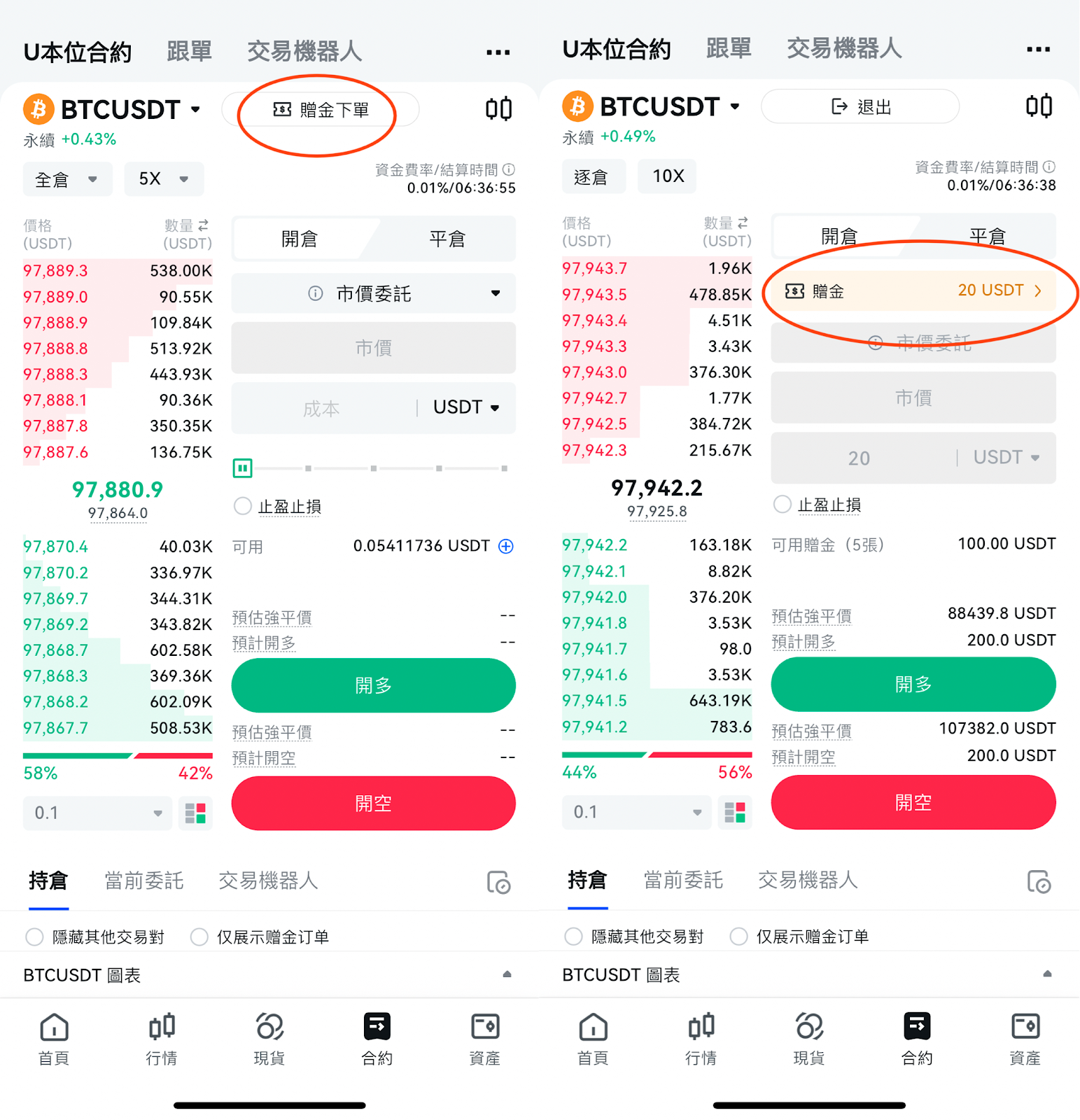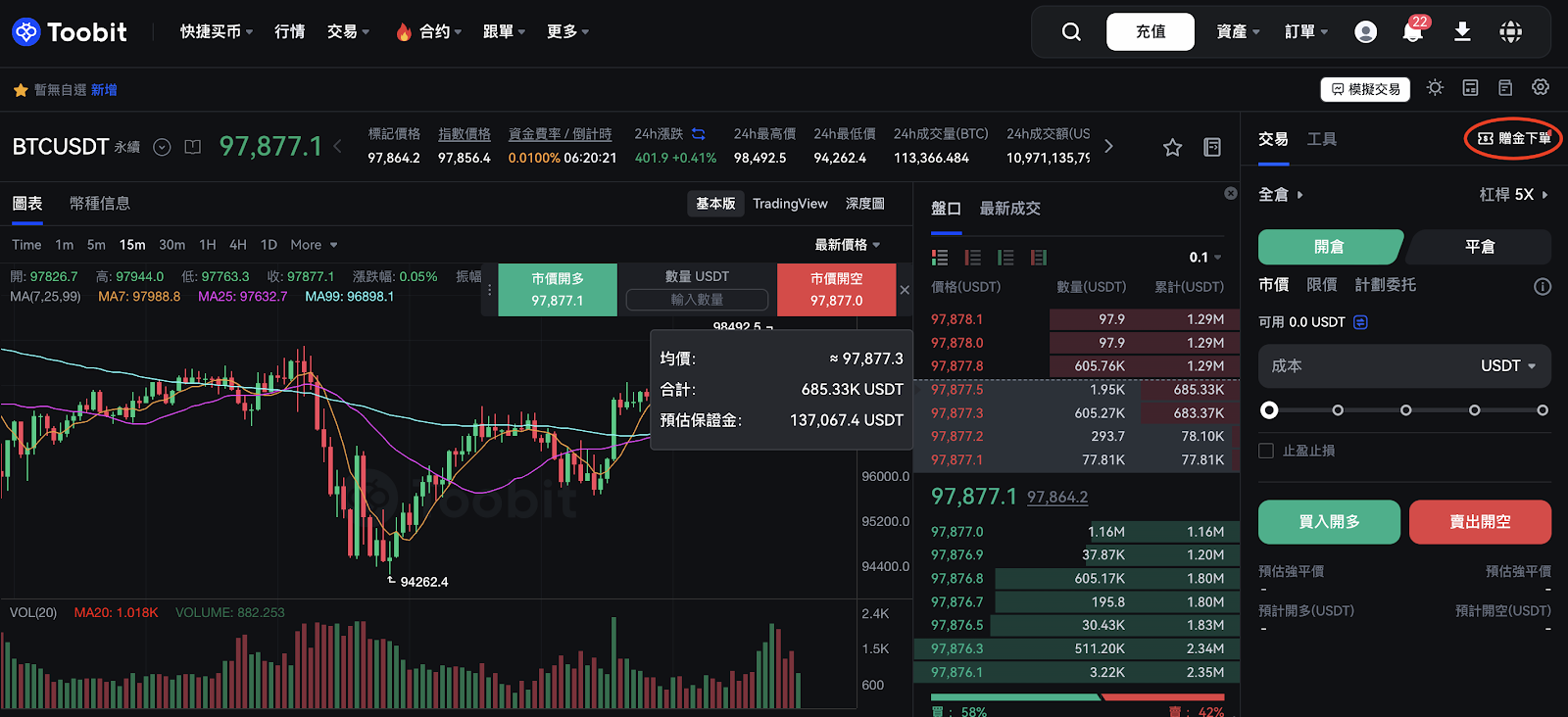 1. 當您來到合約交易頁面後,在右上角點選【贈金下單】,選擇可使用的贈金;