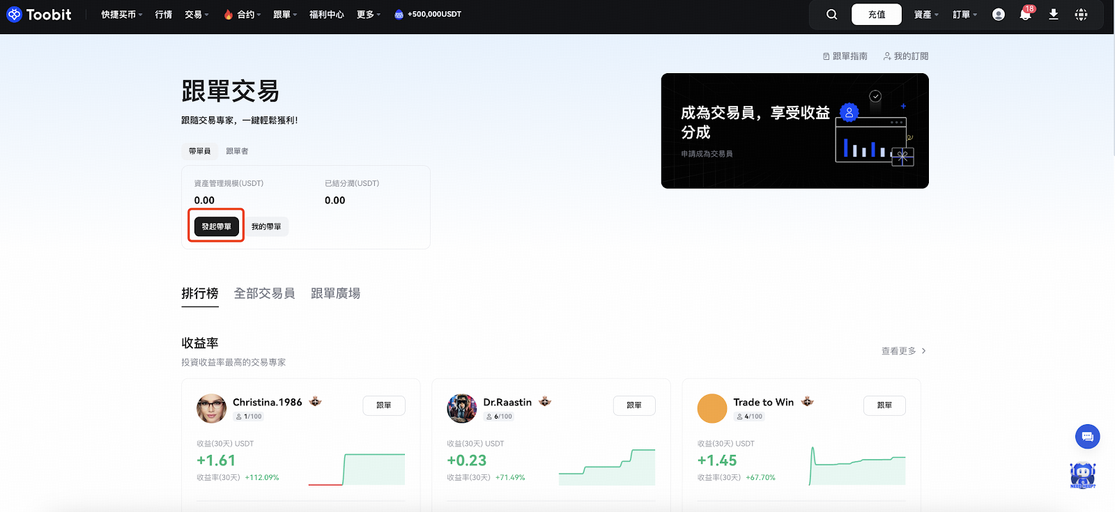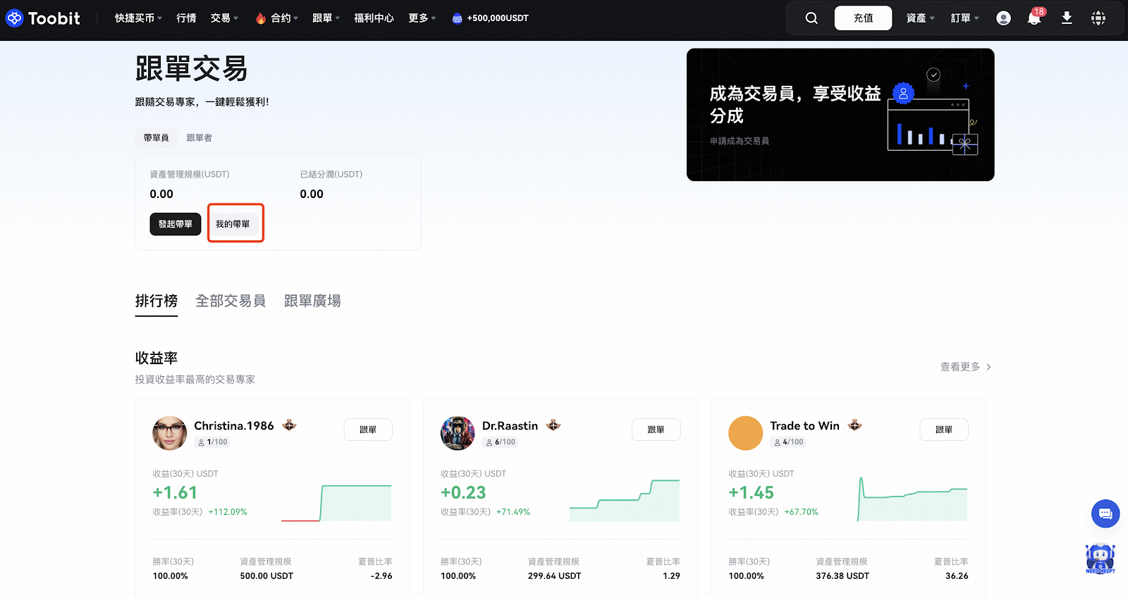- 立即帶單:前往【跟單交易】頁面,開啟您的帶單之旅;