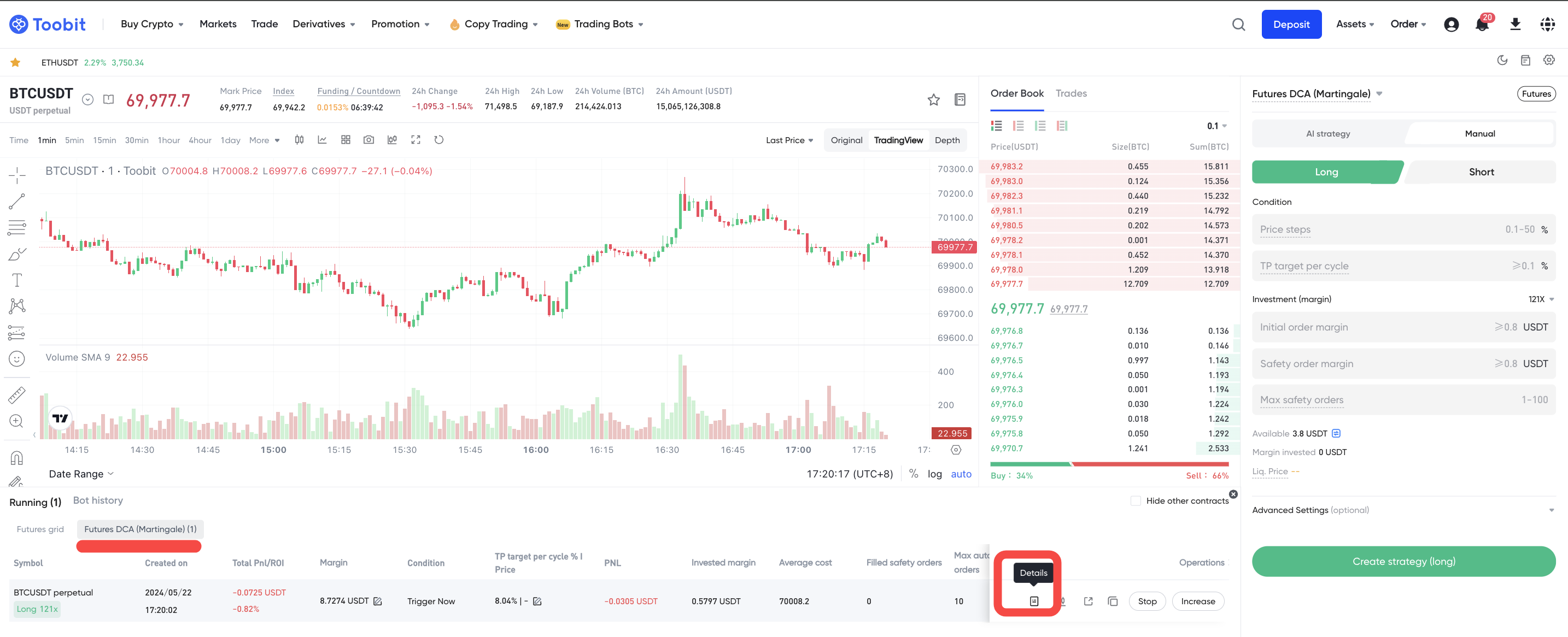 您可以點擊詳細信息在您想要查看的運行中的機器人頁面中,探索更多信息,包括您的馬丁格爾機器人的當前狀態。