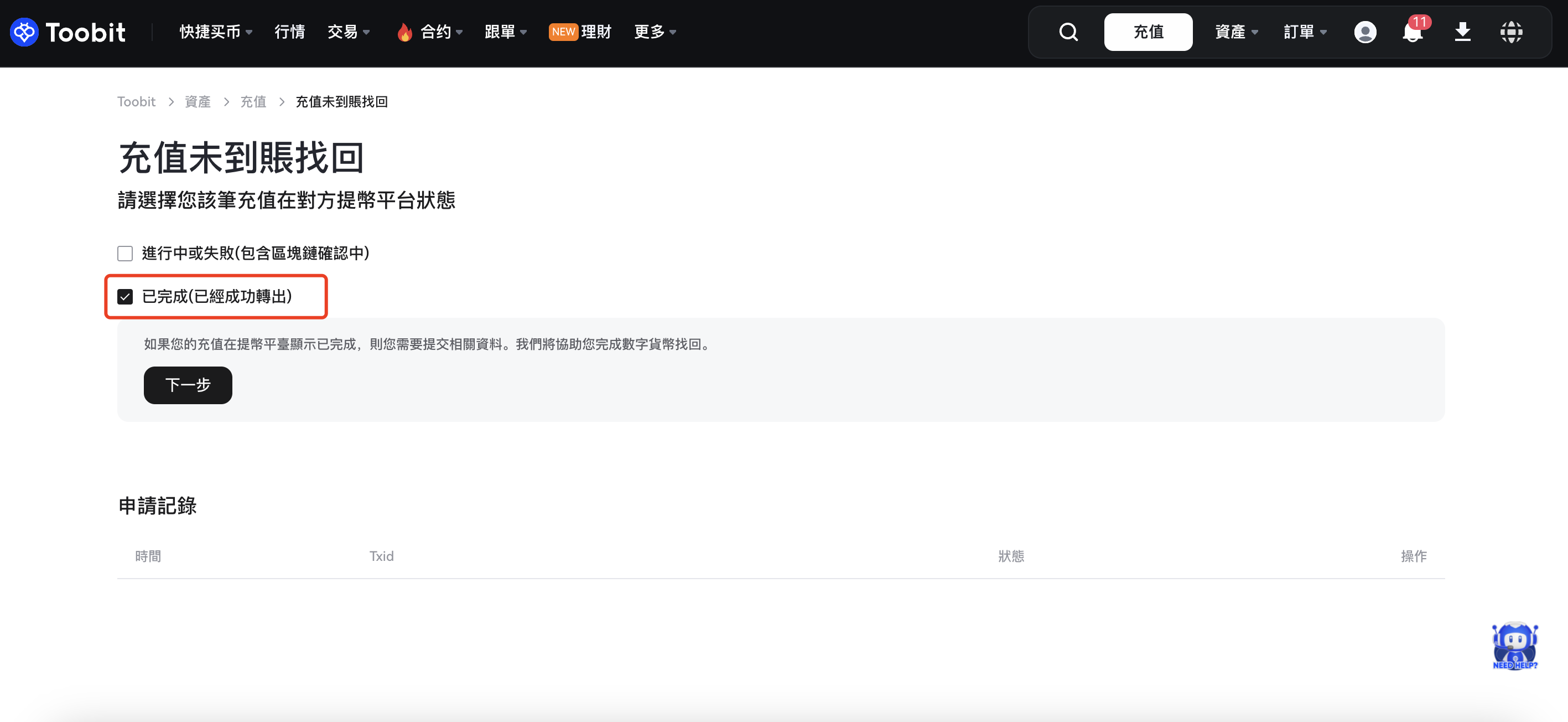 注意:如果存款未完成或失敗,請等待或聯繫其他平台。 資金尚未到達 Toobit。