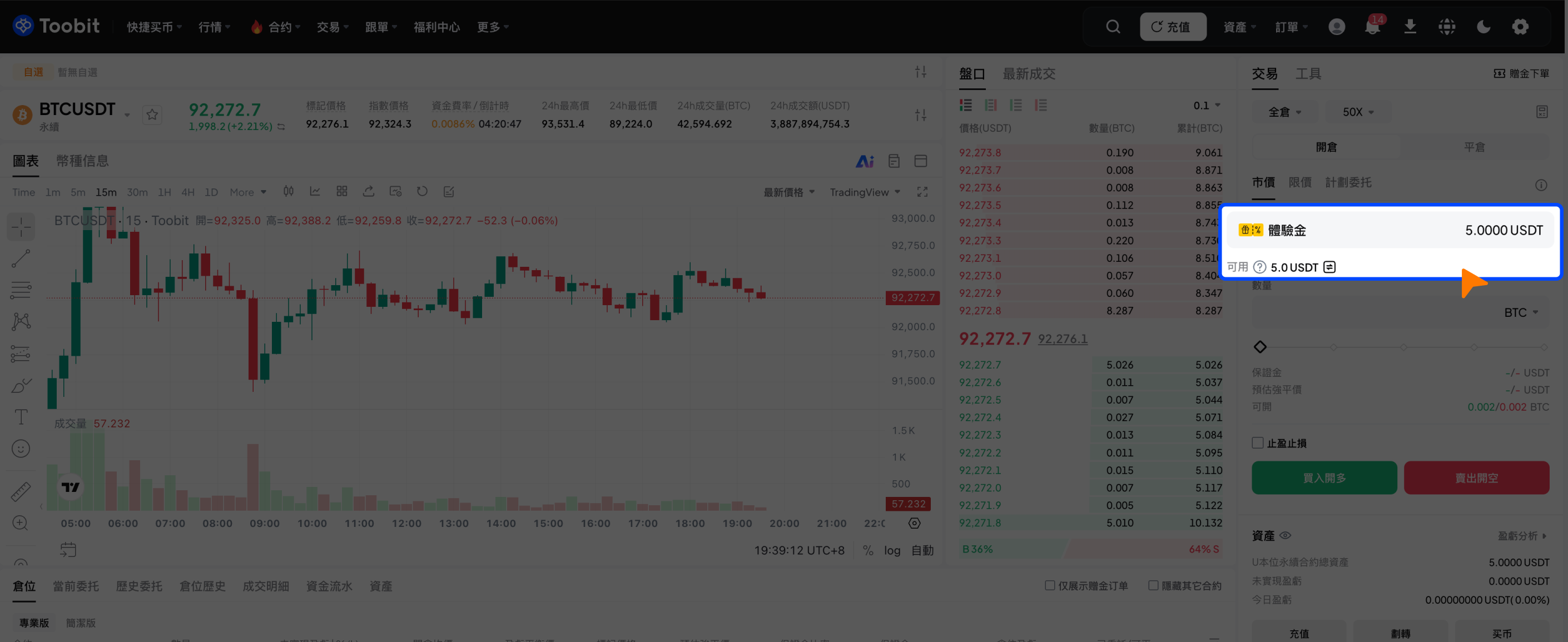 使用體驗金可以參與真實合約交易,並可用於抵扣交易手續費、資金費率及交易虧損。體驗金通常可透過平台活動或福利中心獲取。